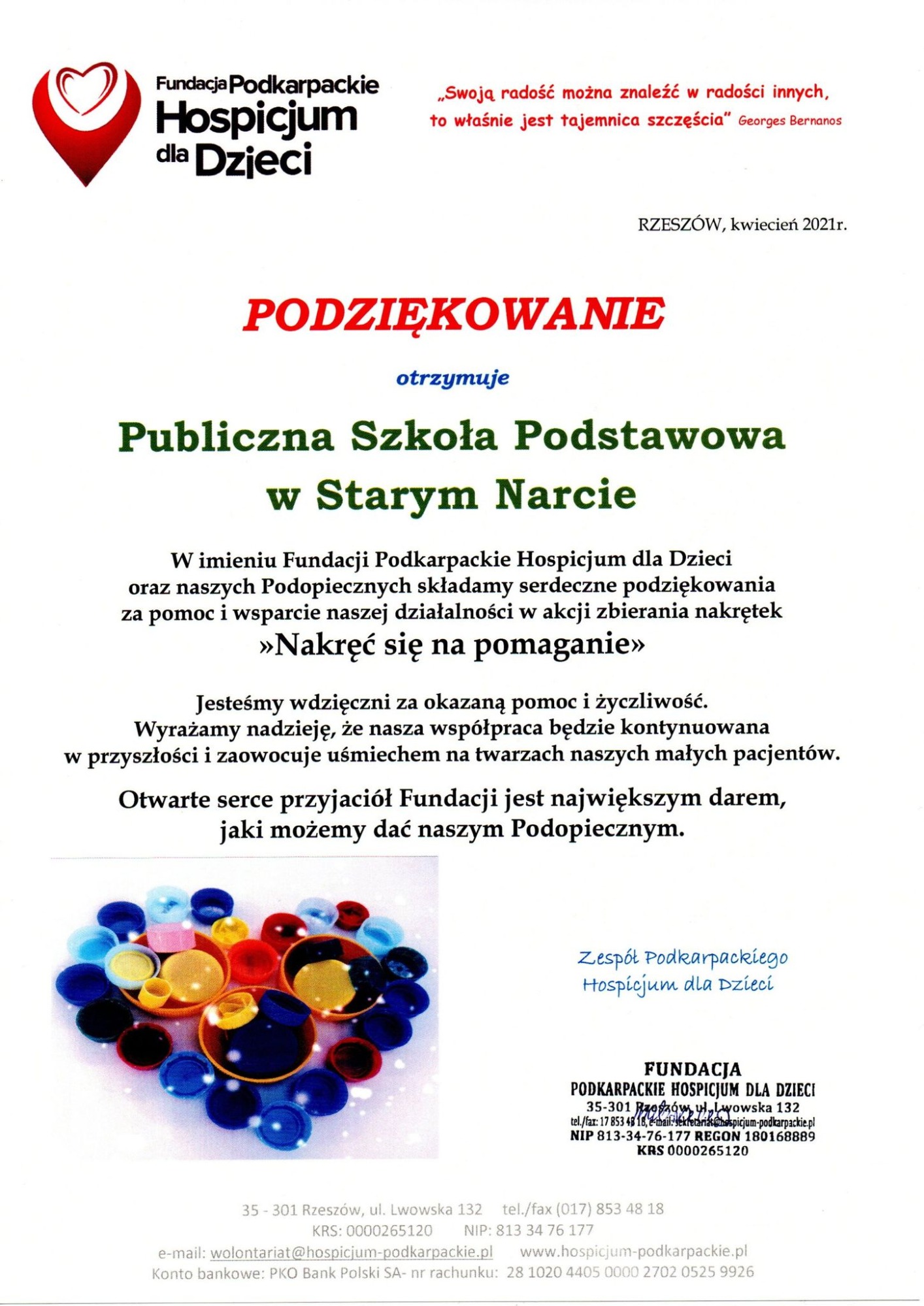 Serdecznie dziękujemy wszystkim za przyłączenie się do akcji. Jednocześnie zachęcamy do dalszego zbierania nakrętek i dostarczania ich do szkoły.