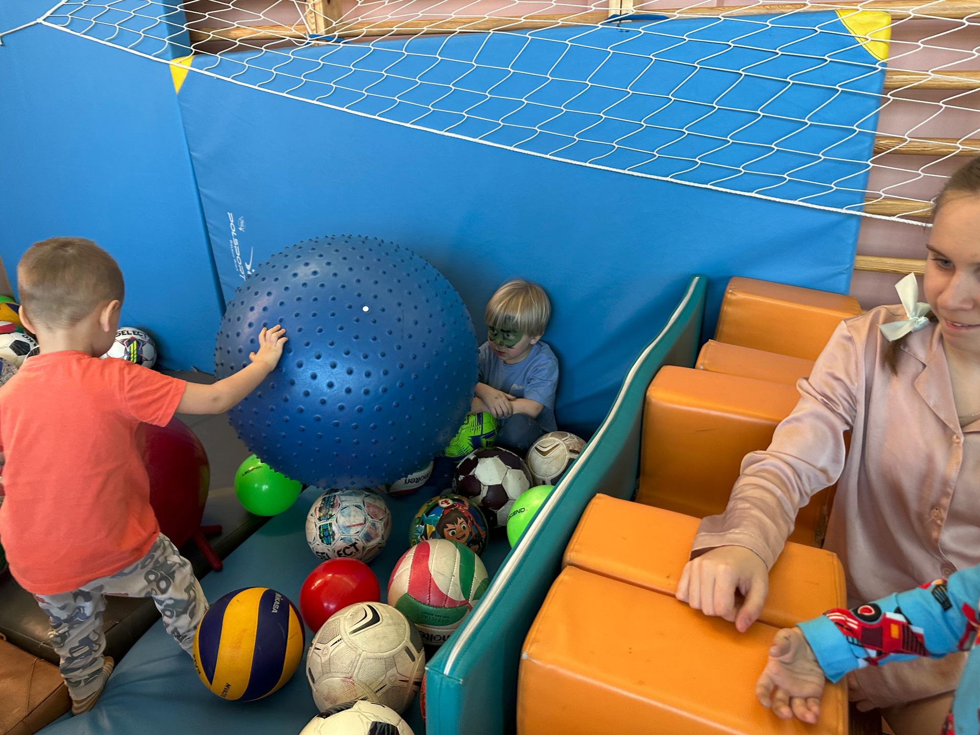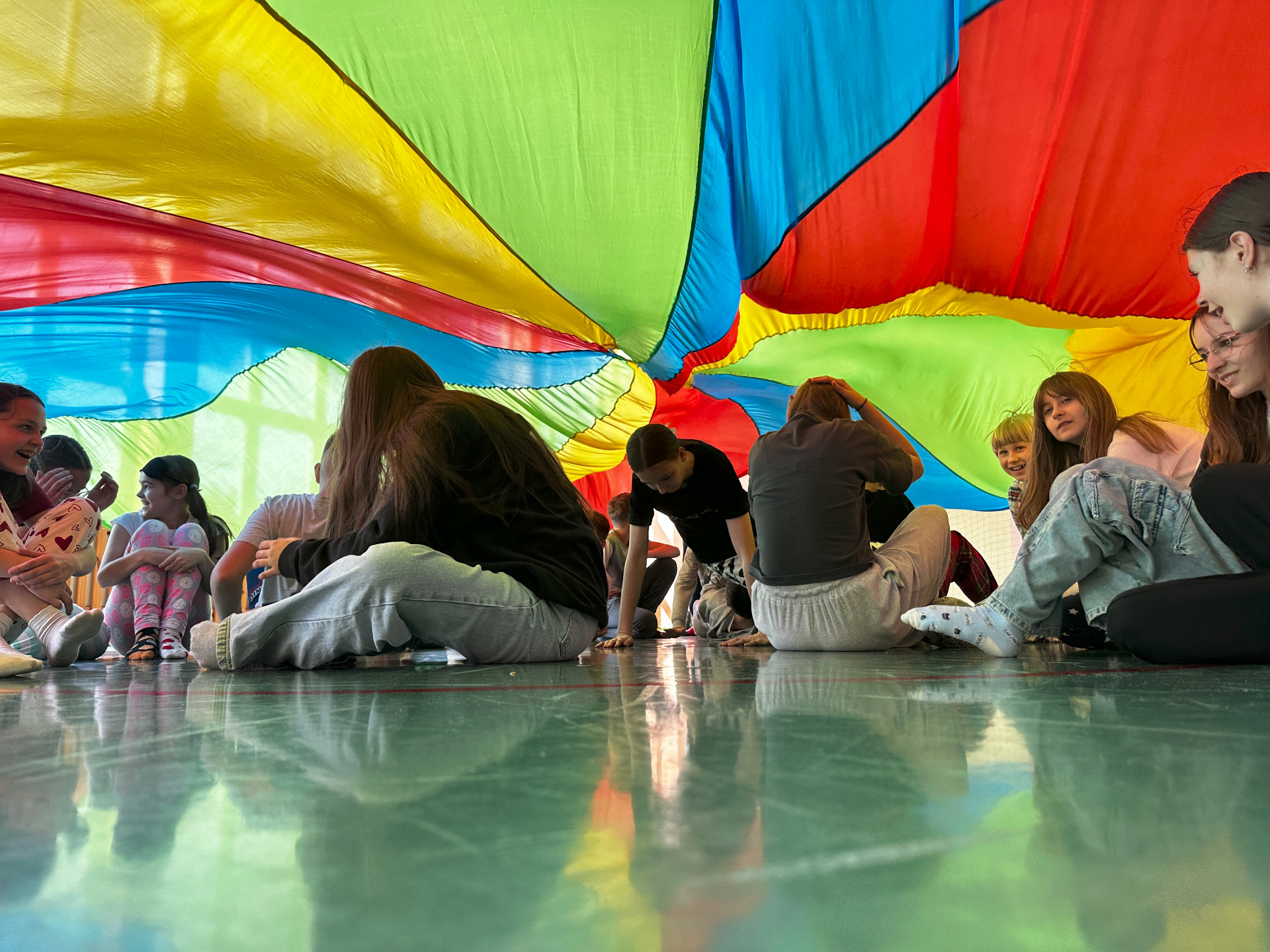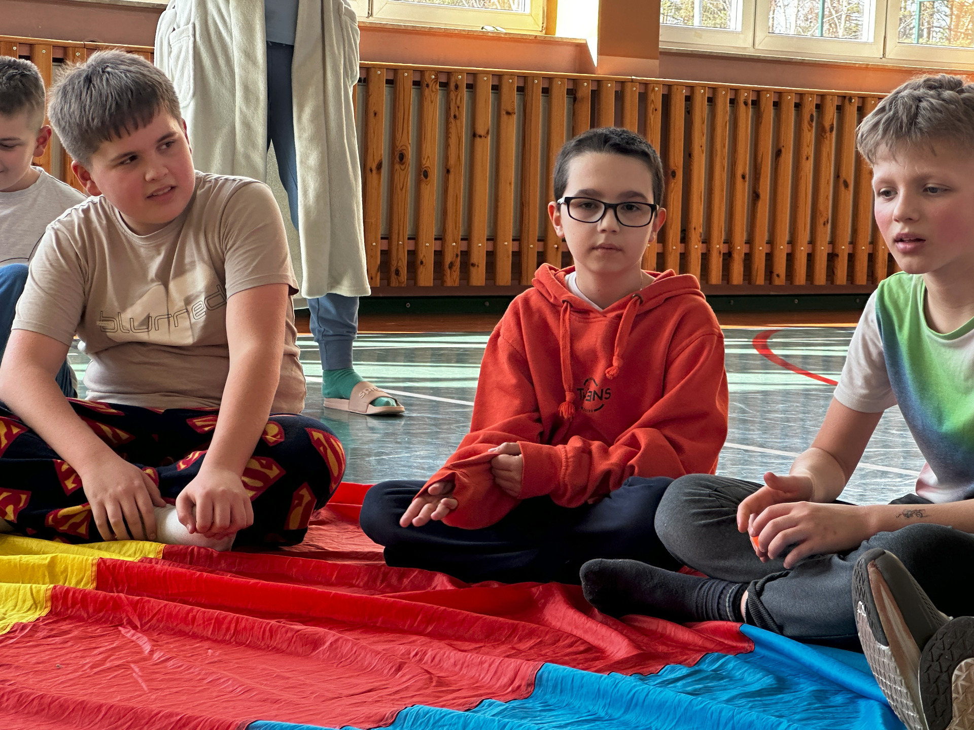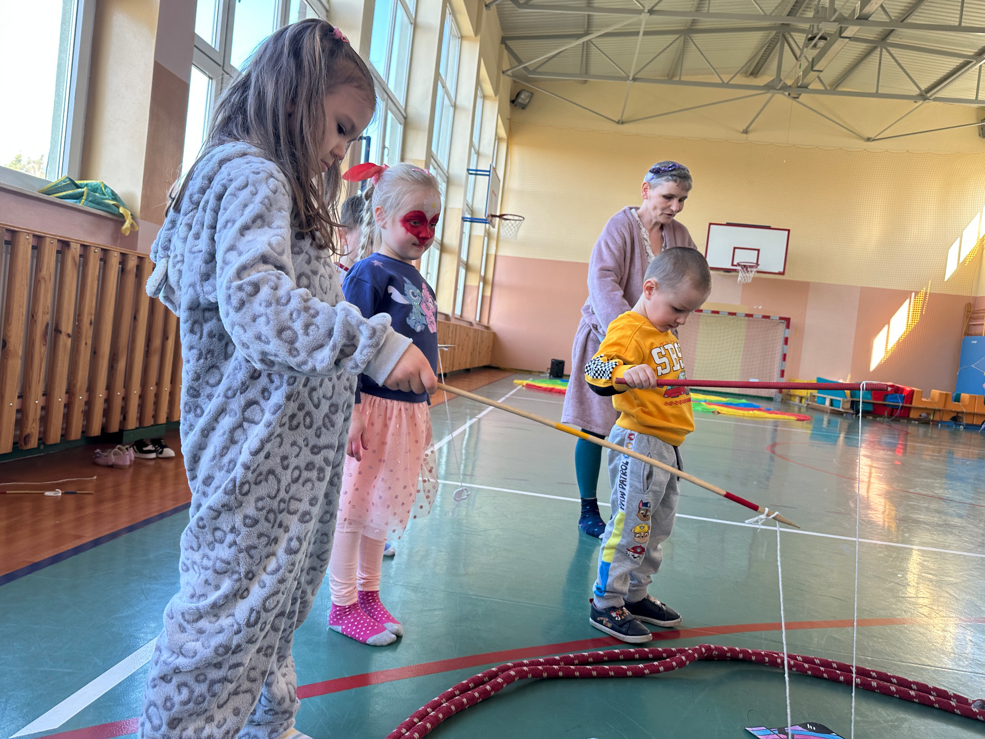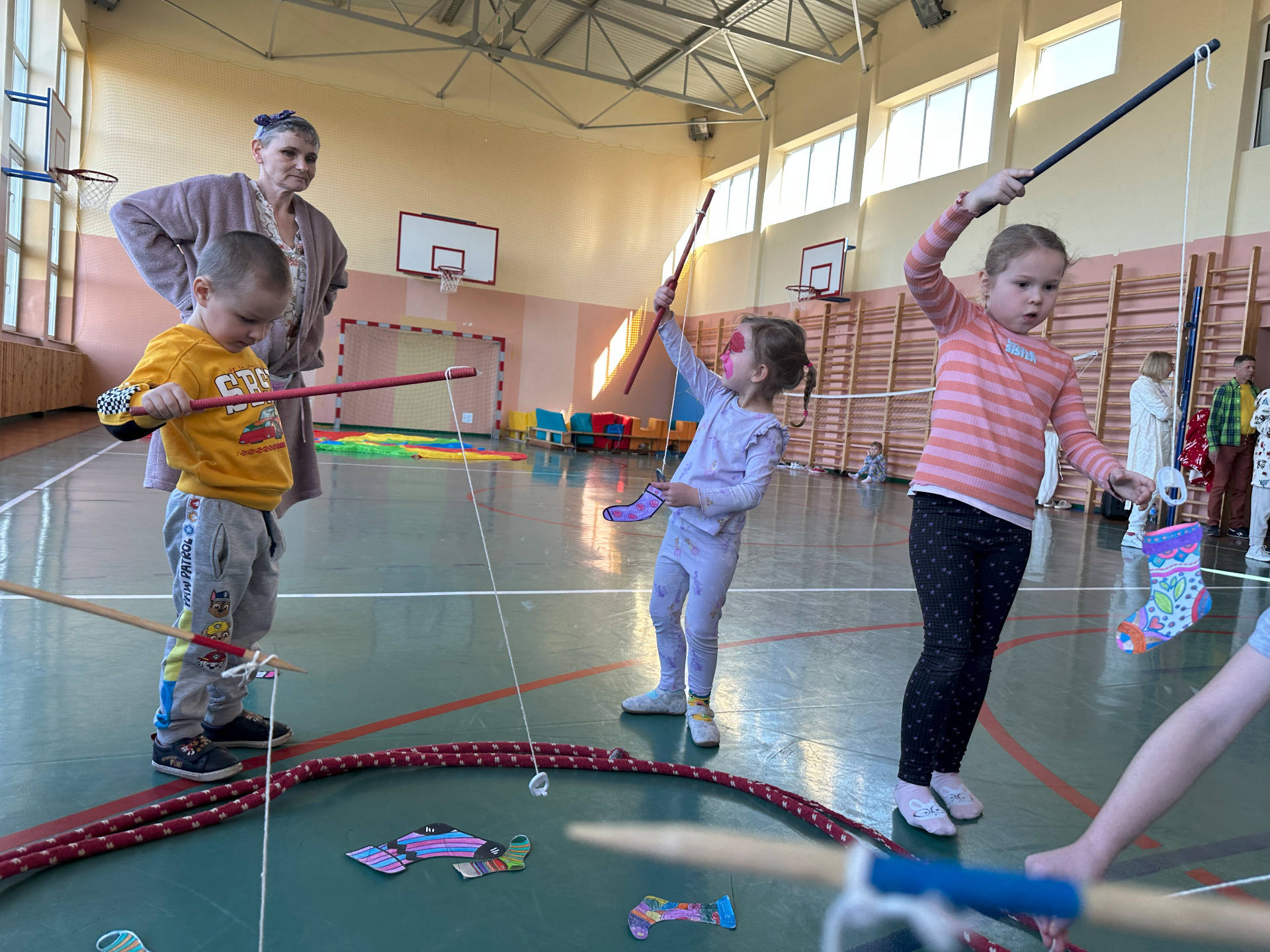 Na sali gimnastycznej czekały na nas: gry i zabawy, łowienie kolorowych skarpetek, zabawy z chustą animacyjną, tunel, w którym szukaliśmy skarpetek, basen z piłkami, muzyka i taniec.